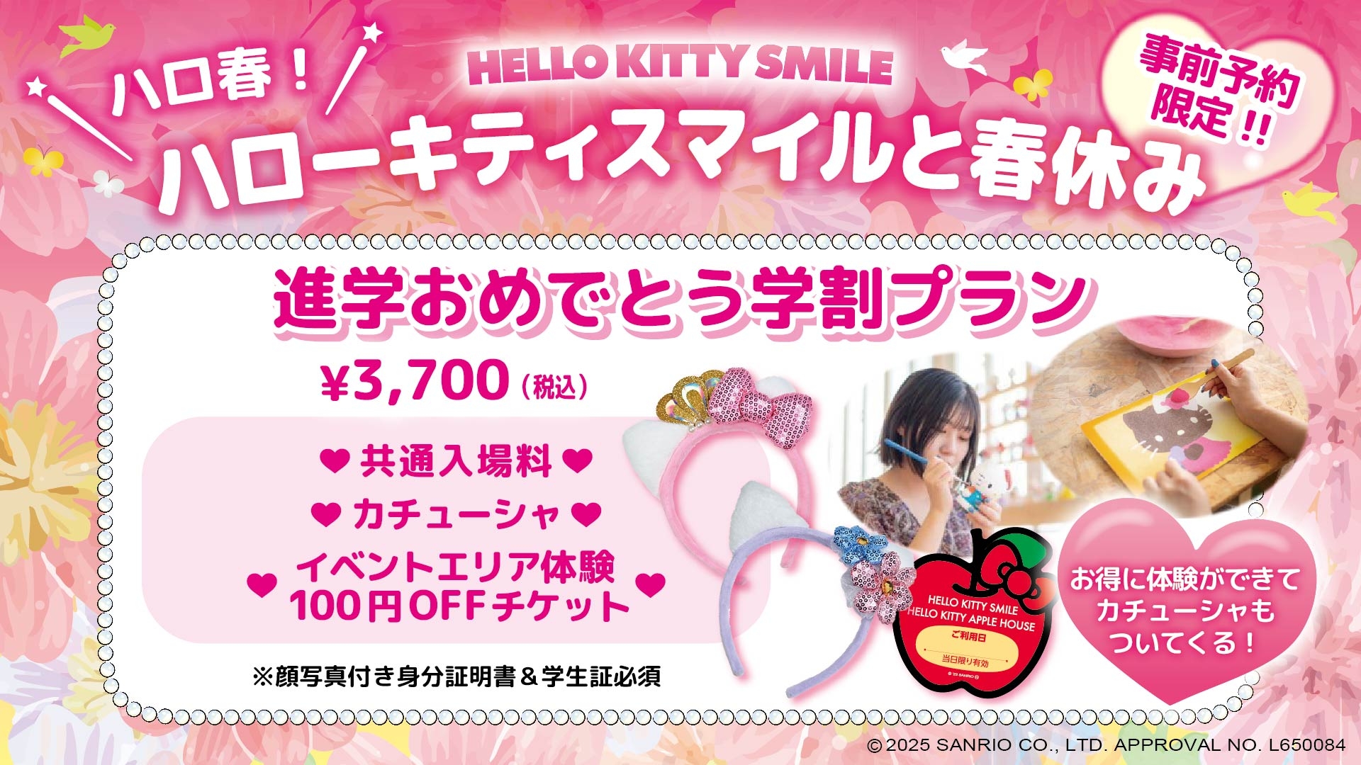 株式会社サンリオのキャラクター「ハローキティ」をテーマにしたメディアアート&レストラン「HELLO KITTY SMILE」では、3つのハローキティの施設「AWAJI HELLO KITTY APPLE LAND」への共通入場券に加え、大人気のHELLO KITTY SMILE限定のオリジナルカチューシャや、大好評の素焼き絵付け体験などのイベントエリアで利用可能な100円割引チケットがセットになった学生限定の特別プラン『事前予約限定!進学おめでとう学割プラン』を2月1日(土)より販売開始いたします。