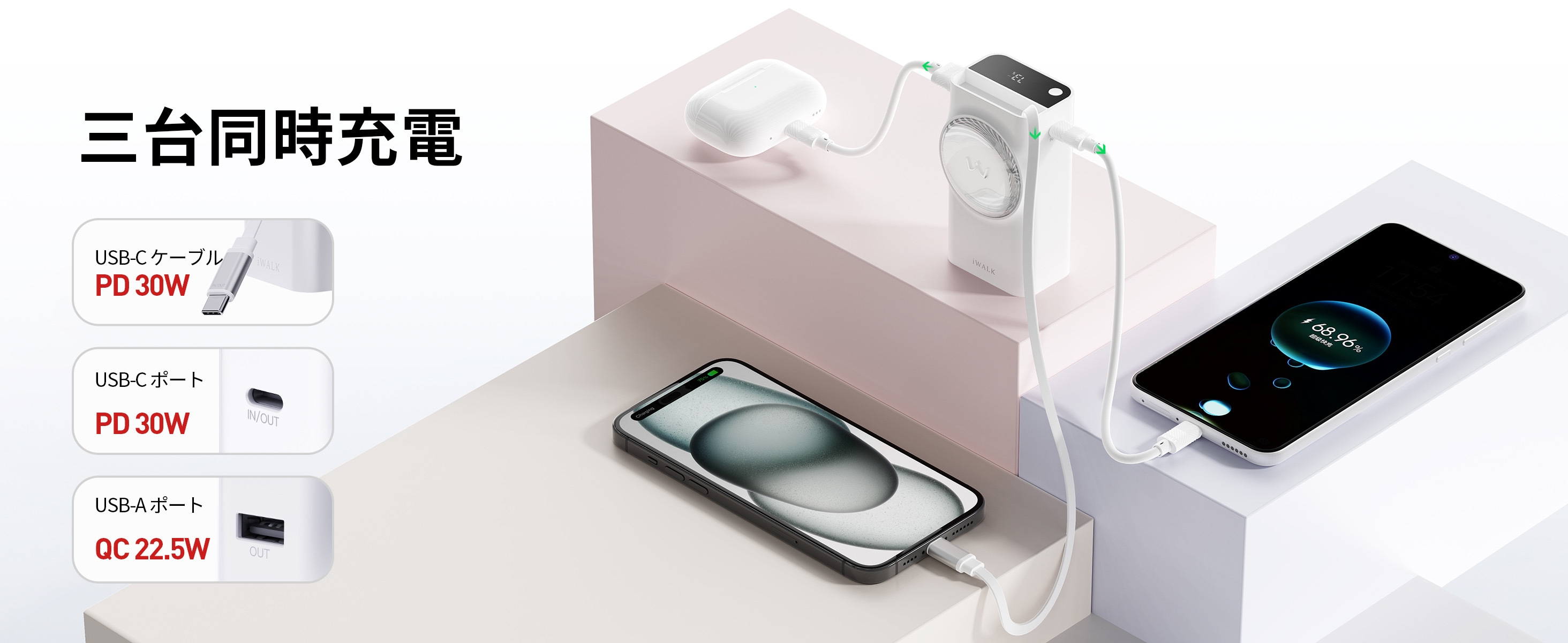 iWALK LinkPod Reel 30Wは、あらゆるシーンであなたの充電不安を解消します。シンプルで洗練されたデザインと高機能を兼ね備えたこのモバイルバッテリーで、より豊かなモバイルライフをお楽しみください。