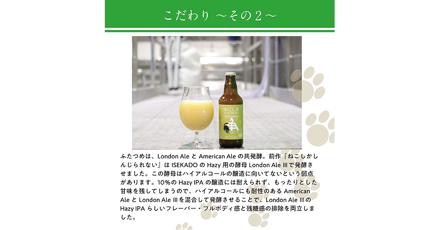 これはISEKADOの定番商品である「ねこにひき」をベースに、最高のジューシーさとスムーズな味わいを実現するために開発されたビールです。