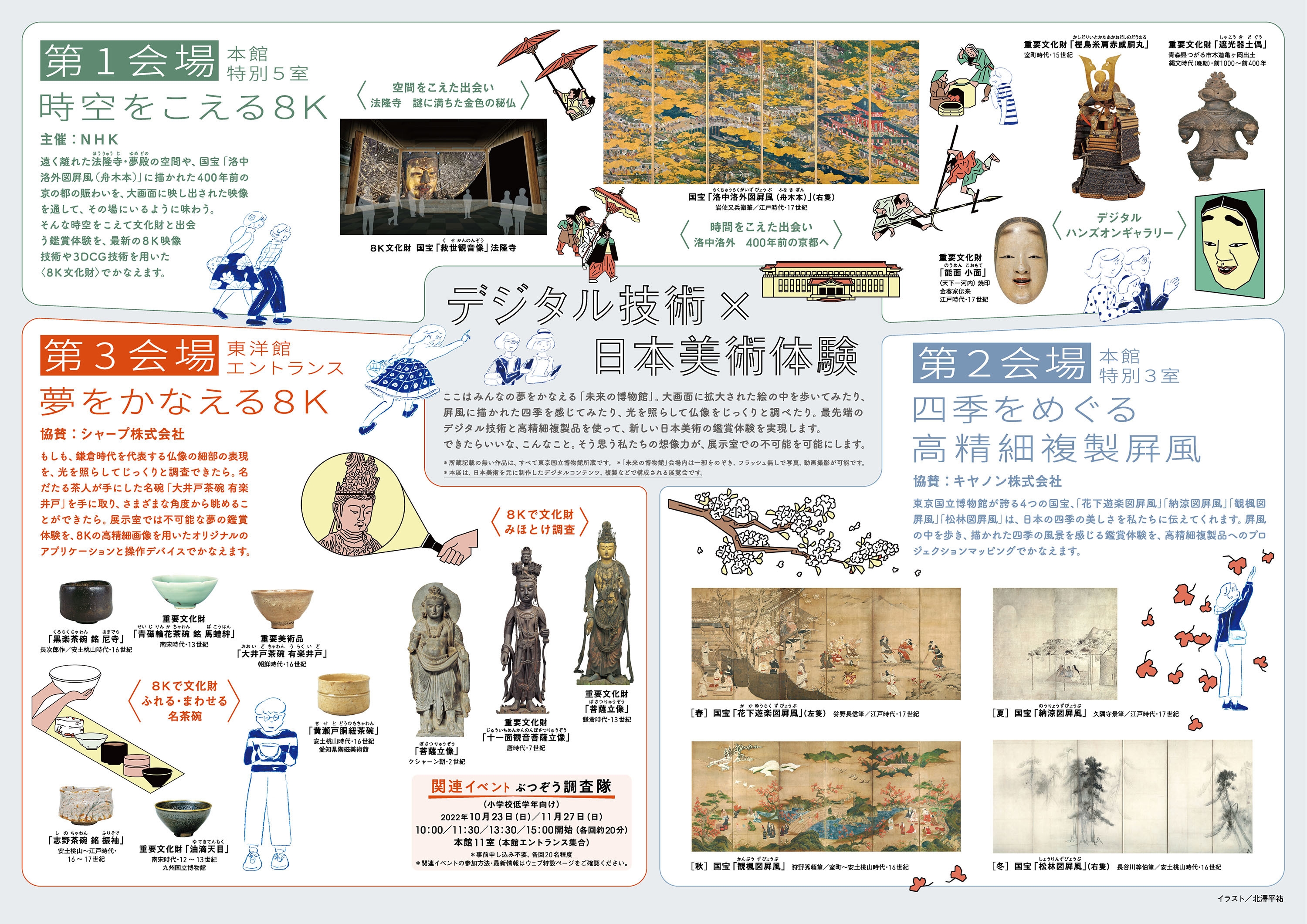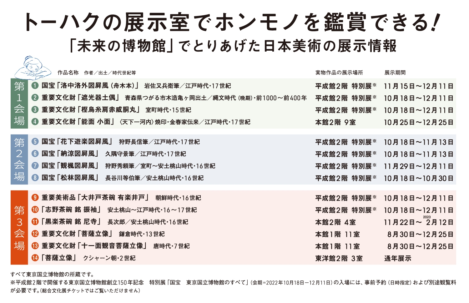 また、「未来の博物館」でとりあげるほとんどの日本美術作品(14件)は、同時期開催の特別展「国宝 東京国立博物館のすべて」(平成館)や総合文化展に展示されます。「未来の博物館」をみたあとに、ホンモノの日本美術をじっくり鑑賞すると、一味違った見え方になるかもしれません。