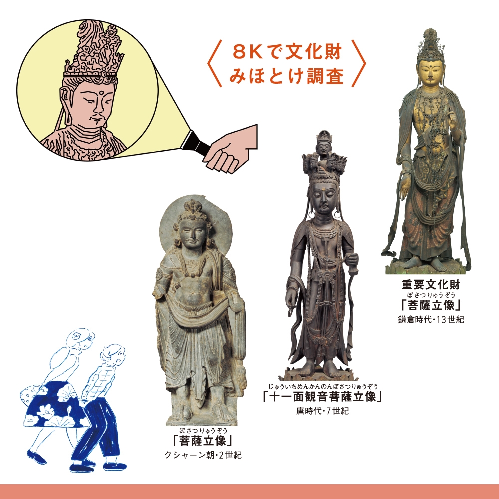 ここはみんなの夢をかなえる「未来の博物館」。大画面に拡大された絵の中を歩いてみたり、屏風に描かれた四季を感じてみたり、光を照らして仏像をじっくりと調べたり。最先端のデジタル技術と高精細複製品を使って、新しい日本美術の鑑賞体験を実現します。