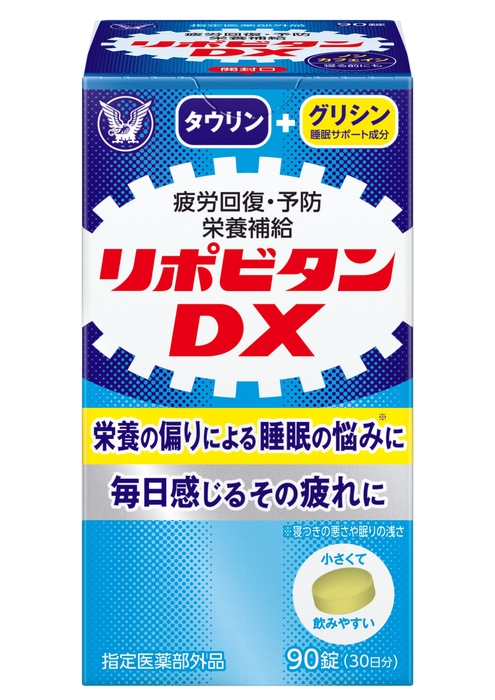 「リポビタンDX」は、「リポビタン(錠剤)」として発売されたブランド第一号製品以来の、約40年ぶりに登場した錠剤タイプの疲労回復を目的としたビタミン剤です。15才以上1日1回3錠の服用で、エナジーサイクルに働きかけるタウリン500mgやビタミンB1,B2,B6が摂取でき、またグリシンとシゴカの睡眠サポート成分を配合しているため、日々の生活で疲れを感じる方やしっかり寝たのに疲れが残る方におすすめの製品です。ノンカフェインで、おやすみ前の服用も考えて開発しております。
