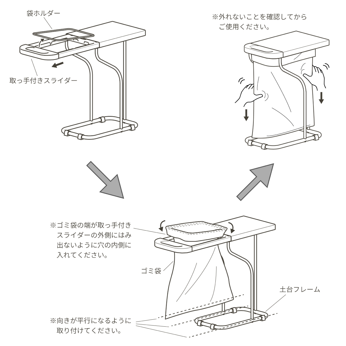 ※30Lのゴミ袋を使用する際は、 土台フレームにあたらないようにゴミ袋の下端を床から浮かせた状態で取り付けてください。また45Lのゴミ袋を使用する際は、30Lと同様にゴミ袋の下端を浮かせて取り付けるか、ゴミ袋の上部にゆとりを持たせ床に付けた状態で取り付けてください。
