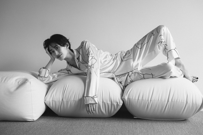 「見た目も着心地も重視した、品のあるリッチなルームウェアです。ミニマムスタイルが好きな方が柄のパジャマを着たらどうなるかを想像し、ありそうでなかった柄を一からデザインしました。体を美しくしてくれるスムーズスキンさんとのコラボだからこそ、美しい体の曲線を描いたところがポイントです。シルクのような、でもストレッチが効いた、そんな夢のような生地を探し、まさに私が欲しかった理想のパジャマが出来上がりました」と神山さん。