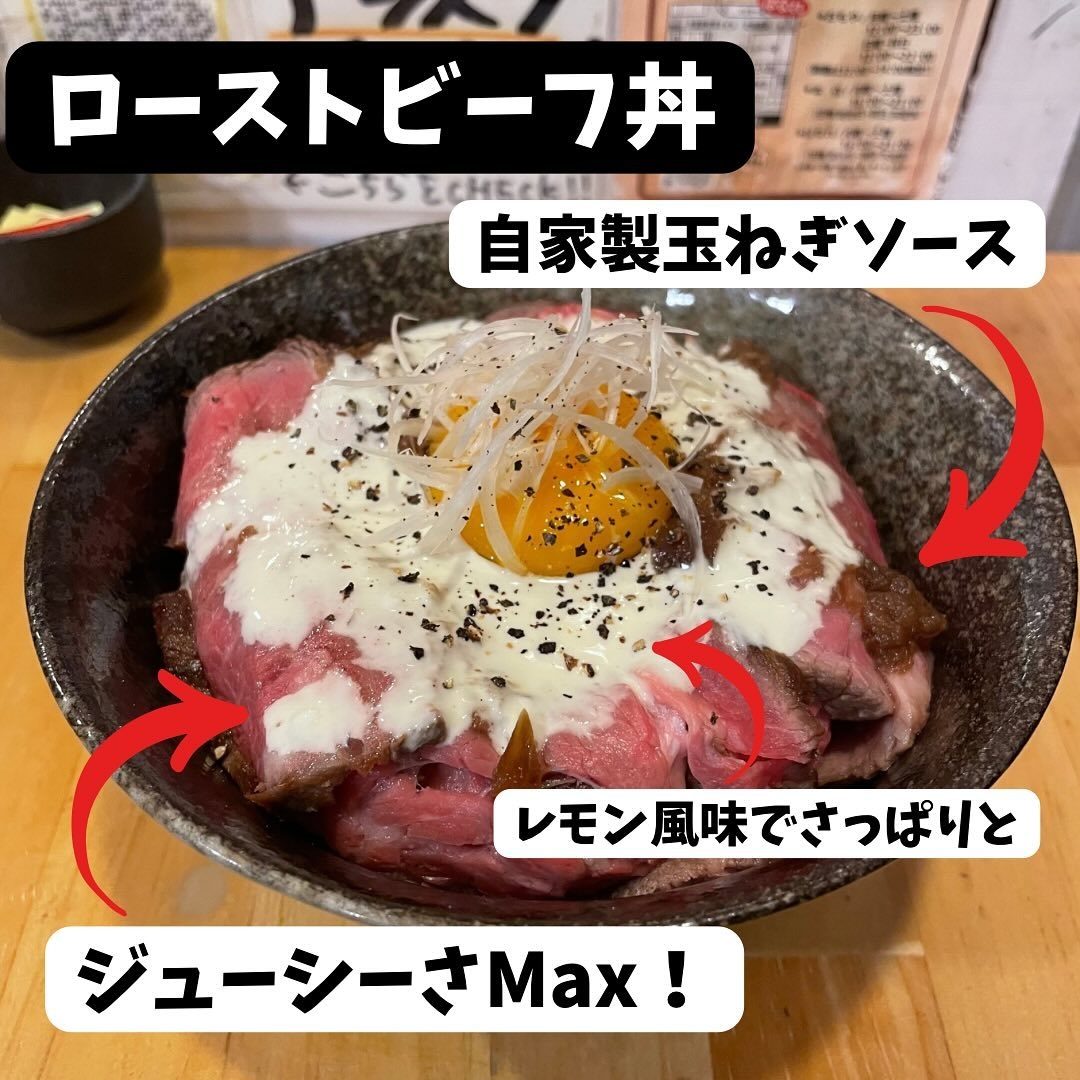 - トッピング:ごはん大盛り(無料)、ローストビーフのつまみ食い(100円)、煮卵追加(100円)、角煮追加(300円)