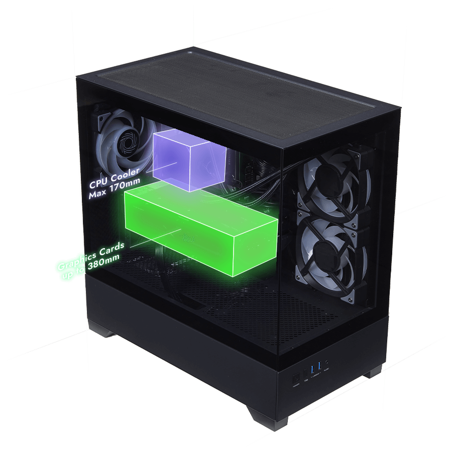 搭載可能なグラフィックスカードは最長380mm、CPU クーラーは高さ170mmまで対応。内部ドライブベイは、3.5/2.5インチ×2基搭載可能。