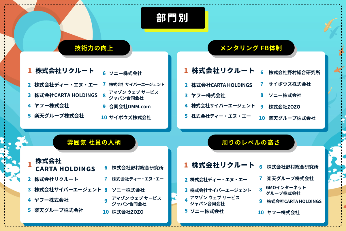 部門別ランキングでは、「技術力の向上」、「メンタリング、フィードバック体制」、「周りのレベルの高さ」の3部門でリクルートが1位を獲得。「雰囲気、社員の人柄」ではCARTA HDが1位となり、総合ランキング上位の企業が部門別ランキングでも上位に名を連ねる結果となりました。