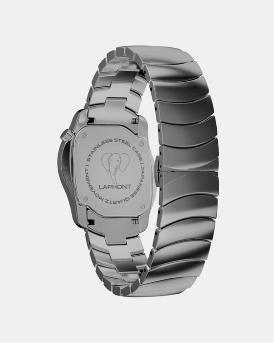 ケースと連続するように設計されたカスタムメタルブレスレットは、静と動のバランスを象徴し、LAPHONTが追求する“構築美としての時計”という哲学を体現しています。