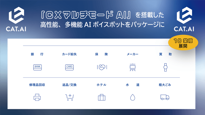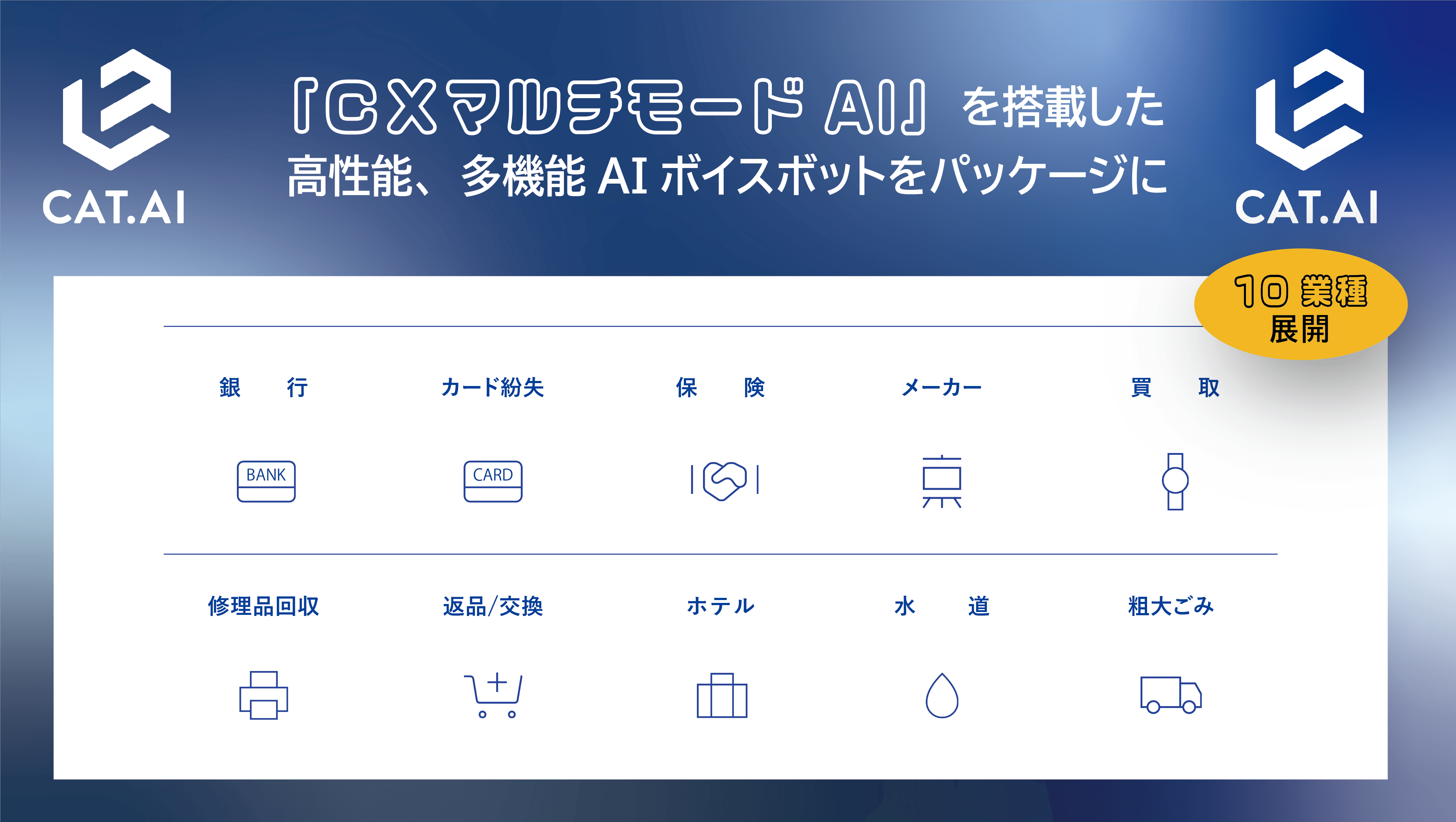 株式会社トゥモロー・ネット(本社:東京都品川区、代表取締役社長:李 昌珍、以下 トゥモロー・ネット)は、最新型「ナビゲーション型」対話AIソリューション「CAT.AI(キャットエーアイ)」の業種別パッケージ製品を販売開始することを発表します。10種類の業種ごとにユースケースを設定し、個別のユーザーナビゲーションシナリオを生かした、低価格のパッケージ製品の市場展開で、これまで高かったボイスボット製品の導入のハードルを下げ、多くの企業・自治体での導入を目指します。