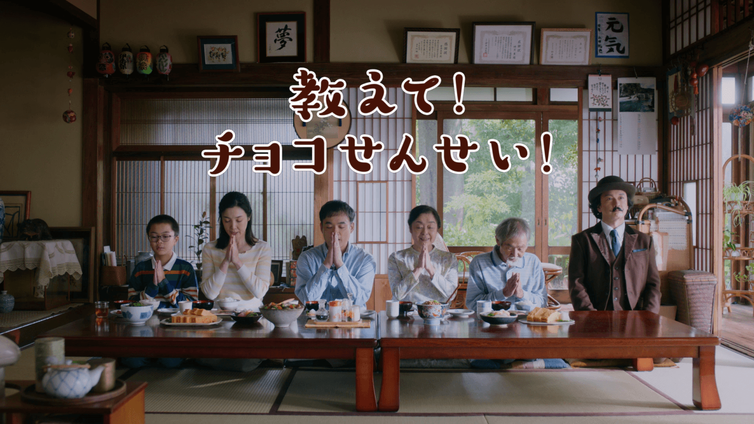 舞台は、とある家族の食卓。家族の一員かのように現れたチョコ先生は、チョコレート効果の魅力を力説し始めます。チョコ先生の熱弁に聞き入る家族は、気が付けばチョコ先生の存在をすんなり受け入れている様子。見知らぬ人が食卓にいることにツッコミを入れつづける子どもを尻目に、最後は家族と一緒においしくごはんを頬張るチョコ先生でした。
