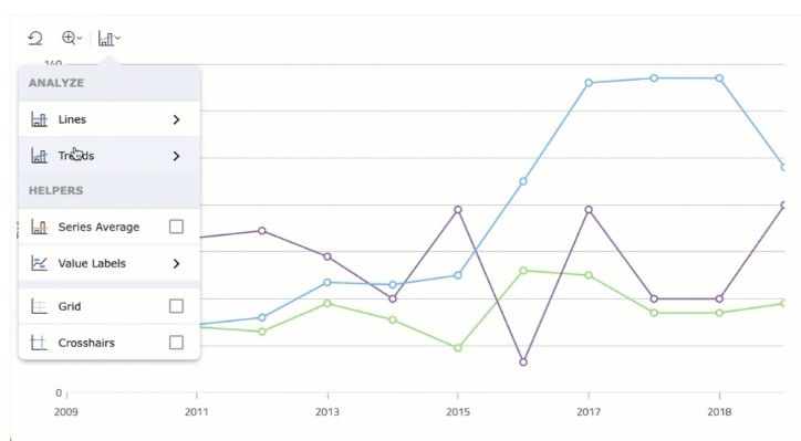 データの視覚化は、モダンなアプリケーションにおいて必須項目となりつつあります。新バージョン23.1では、新機能「Chart Toolbar」を使用し、アプリケーションに次世代のチャート表現を実装することができます。現代の分析ニーズに合わせて構築されたChart Toolbarは、リアルタイムにデータにアクセスし迅速に分析を開始することができます。さらにChart Toolbarには、値のオーバーレイ、データラベル、十字線、グリッド線の表示などのフォーマットオプションや、カスタムボタンによる拡張可能なアクションが用意されており、チャートの使用感や可読性を大幅に向上させることができます。