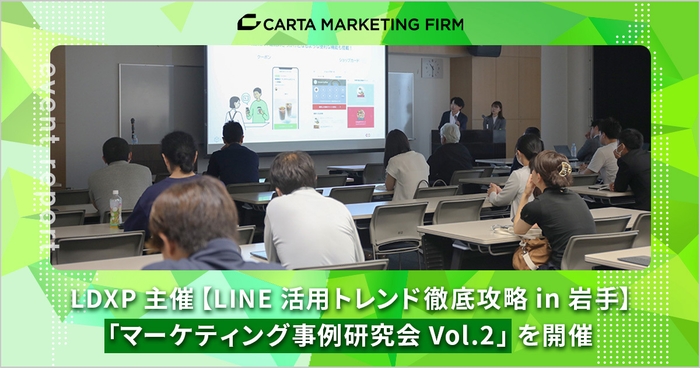 株式会社CARTA HOLDINGSのグループ会社で、マーケティング特化の事業を展開する株式会社CARTA MARKETING FIRM(東京都港区虎ノ門、代表取締役:西園 正志、以下CARTA MARKETING FIRM)は、株式会社ファーストサウンド(東京都中央区銀座、取締役代表:檜山 初音)、杜陵高速印刷株式会社(岩手県盛岡市、代表取締役:西野 正寿)と共同で推進するLDXプロジェクト*の一環として、LINE活用術を学べるプレミアムイベント「マーケティング事例研究会Vol.2~LINE活用トレンド徹底攻略 in 岩手〜」を、「アイーナ・いわて県民情報交流センター」にて開催しました。
