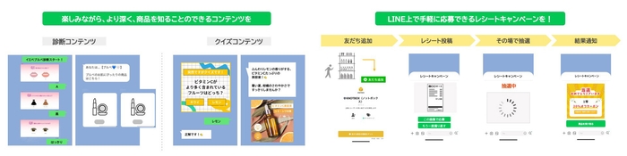 例えば、認知・興味関心段階ではユーザーが楽しみながら、より深く商品を知ることのできる診断コンテンツやクイズなどを配信し、購入の段階では、LINE上で手軽に応募できるレシートキャンペーンを実施するなど、LINE上で可能な具体例も紹介。ユーザーと企業の関係をより強固なものにするためにLINEを有効活用し、ファネル横断型の継続的なマーケティング施策を実施することが重要であると述べました。