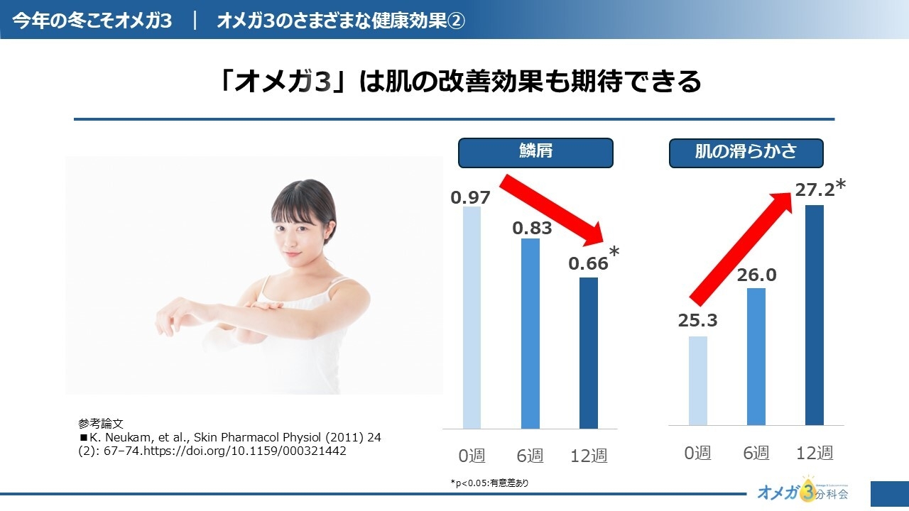 冷え性の主な原因となるのは「血流不全」です。オメガ3によって体の隅々まで血液が行きわたるようになれば、冷え性の改善につながります。また、乾燥の気になる冬に嬉しいこととして、オメガ3の継続摂取により肌の状態が改善したという報告(※7)もあります。他にも、この冬から備えておきたい花粉症に関して、オメガ3によって花粉症の症状が緩和される可能性があることも示唆されています(※8)。
