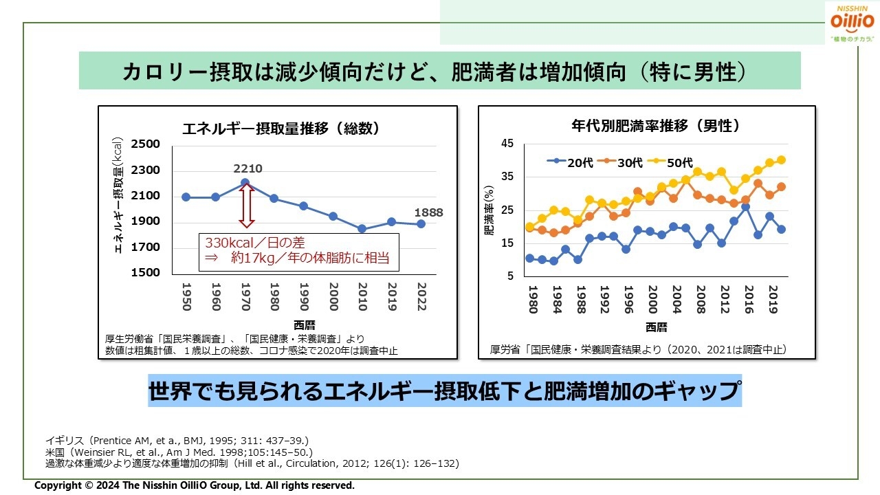 現在の日本人の平均エネルギー摂取量は1,900kcalを下回り、ピークであった1970年代から300kcal以上減少しています。これにより、痩せるのが当然と思われますが、特に男性は各年代を問わず肥満傾向が見られ、エネルギー摂取が少ないのに肥満者が増加するというおかしな現象が起きています。