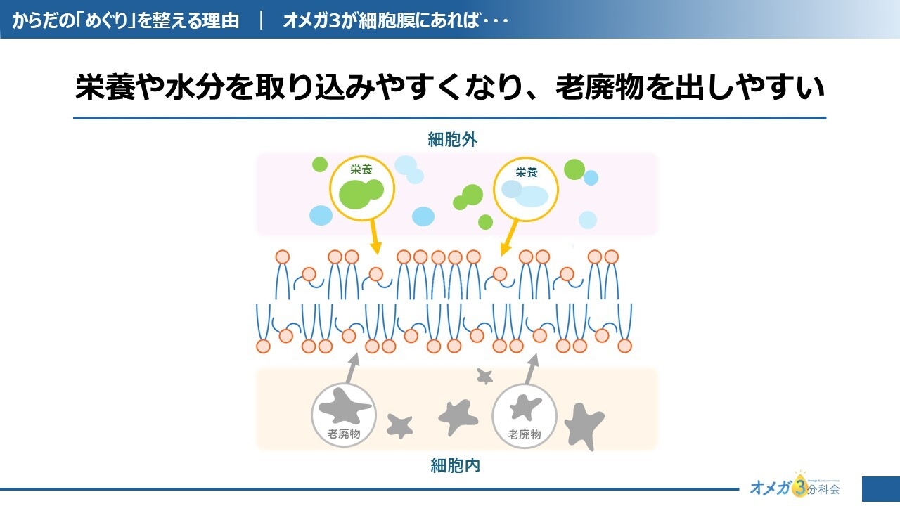 からだの「めぐり」には、細胞を形づくる細胞膜の柔軟性が大きく関わってきます。細胞膜は脂質を材料に作られているのですが、オメガ3を材料に作られた細胞膜には柔軟性がうまれ、柔軟性があれば細胞内外における水分や栄養、老廃物の出し入れがスムーズにできます。