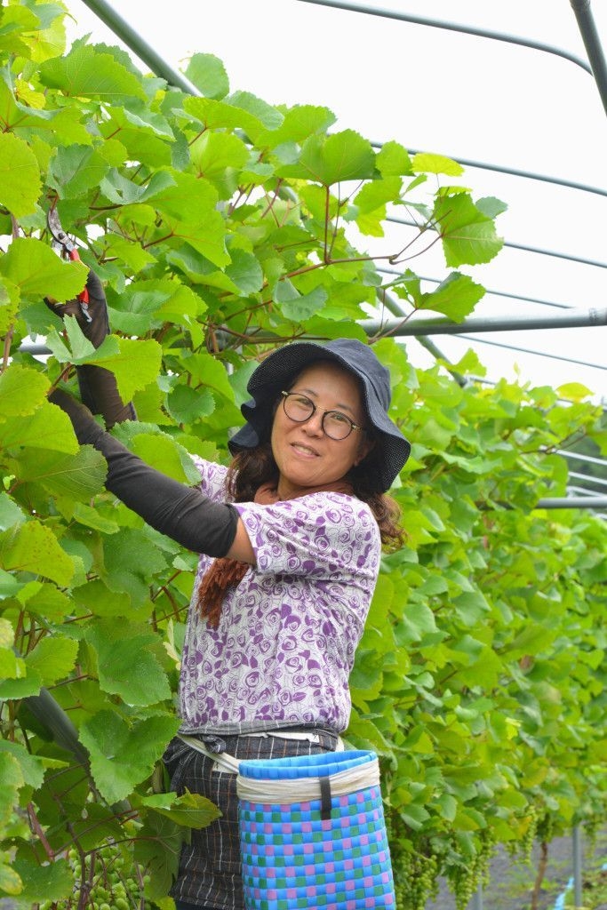 1人目は、南郷地区でブドウを栽培する高長根(たかながね) 律子さん。高長根さんは、農業経験はありませんが、市が支援すると聞き、挑戦を決めました。「ブドウは、手をかければかけただけ応えてくれる。それを加工したワインは孫のようだ。」とブドウ栽培のやりがいを述べ、「いろいろな人と話す機会が増え、私自身が明るくなった。八戸ワインがきっかけになり、ブドウ農家に興味をもつ仲間が増えてほしい。」と満面の笑顔で語ってくれました。