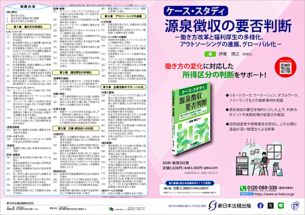 新日本法規出版株式会社(所在地:愛知県名古屋市中区、代表取締役社長:河合誠一郎)は、新刊『ケース・スタディ 源泉徴収の要否判断-働き方改革と福利厚生の多様化、アウトソーシングの進展、グローバル化-』を2025年9月9日(火)に発売いたしました!