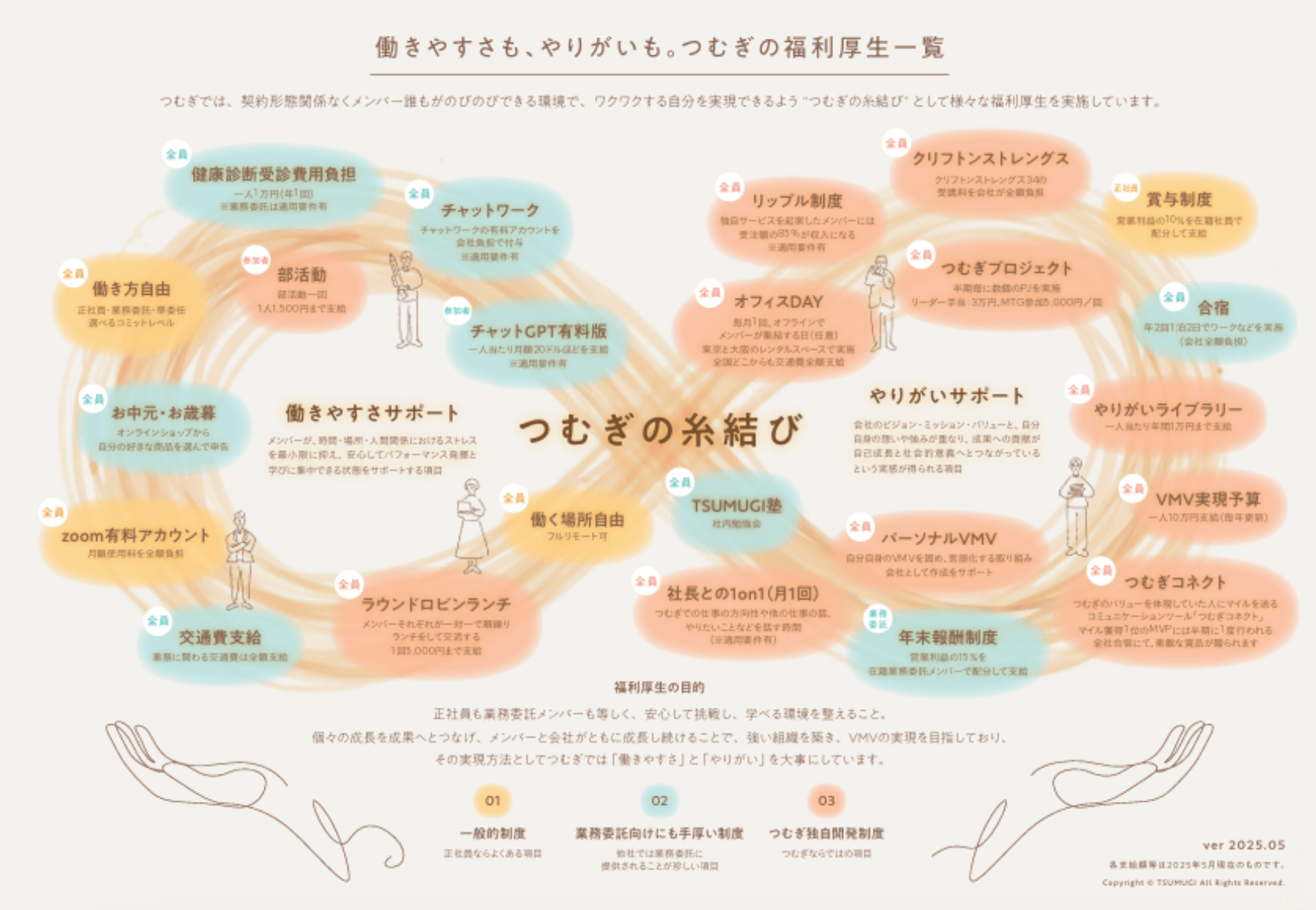また、関わる度合いによって働きやすさが担保されるよう、雇用形態別に福利厚生を設けています。それら23の福利厚生をまとめたのが福利厚生マップ「糸結び」です。