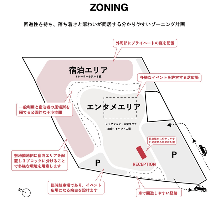 施設概要として、宿泊施設8棟の建設を計画し、各棟にはプライベートサウナを附帯し、飲食棟、共用サウナ棟、多目的コミュニティスペースなども提供予定です。地域の日常に溶け込むよう利用していただく為に、宿泊エリアとエンタメエリアを設け、地域にもひらけたような設計でゾーニングをしています。