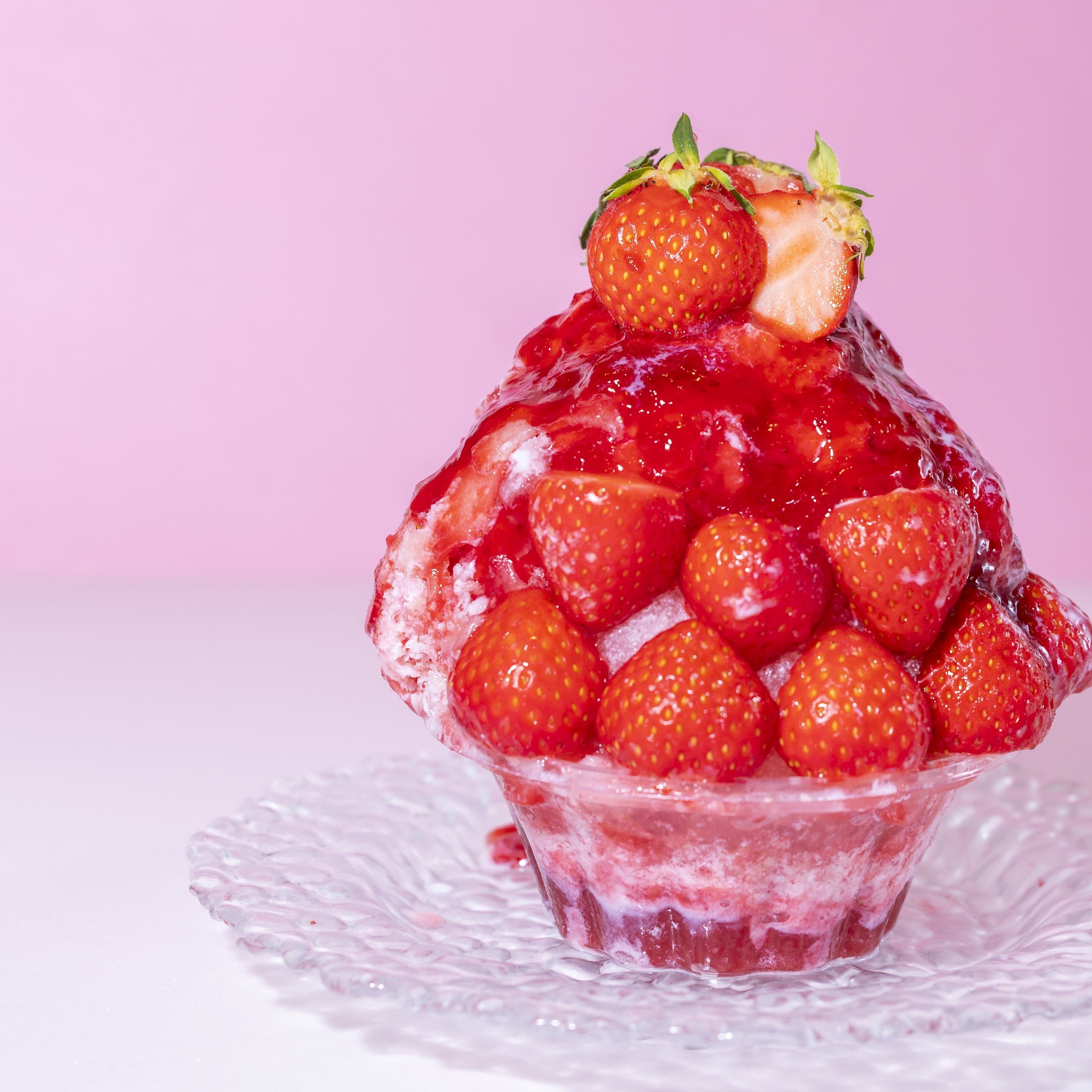 オリジナルの削りいちごをメインに、かき氷のために作ったいちごの果肉感のあるとろとろいちごソースをたっぷりかけて仕上げました。削りいちごは急速冷凍した静岡県産の“丸ごといちご”と“濃厚ミルク氷”を一緒に削ることで、いちごの甘酸っぱさとミルクのまろやかな味わいが絶妙にマッチしています。爽やかな酸味がおいしい夏いちごも7粒トッピング!最初から最後までいちごをしっかり味わえるかき氷です。