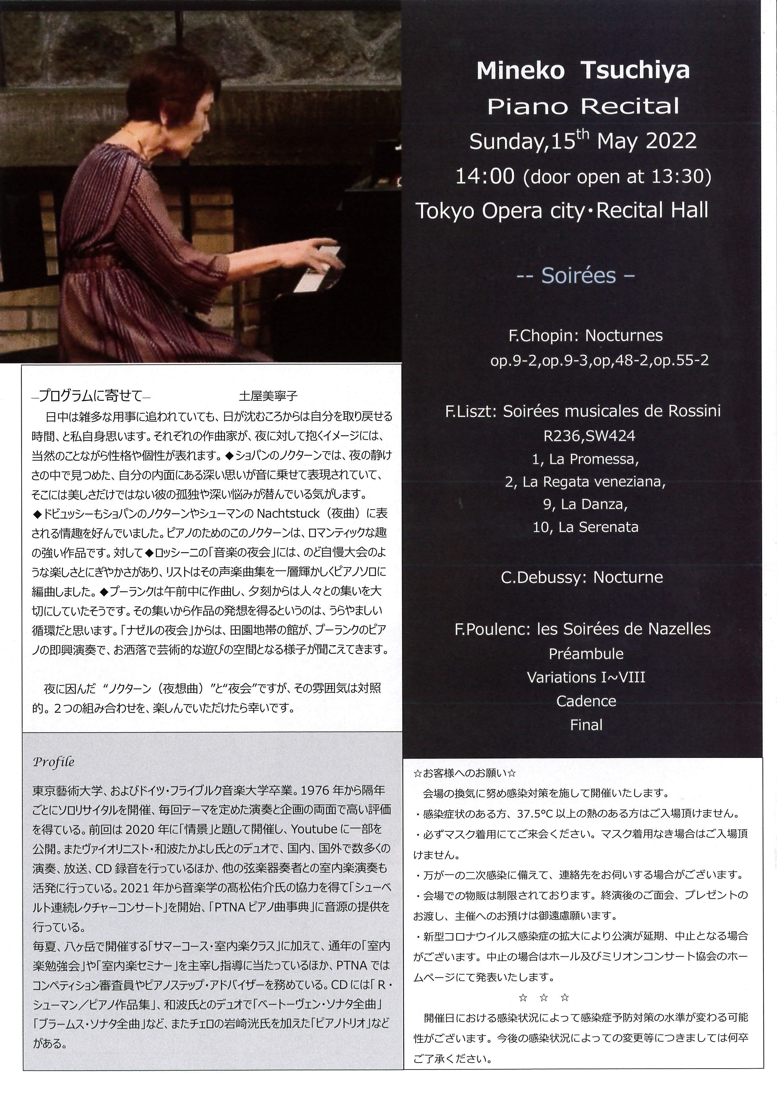 今回のリサイタルのテーマは「夜会」。『日中は雑多用事に追われていても、日が沈むころからは自分を取り戻せる時間』と土屋は言います。夜に因んだ、ショパン、ドビュッシーの「ノクターン(夜想曲)」と、リスト、プーランクの「夜会」。それぞれの作曲家が抱いた夜のイメージを、まさに円熟の境地を迎えた土屋美寧子の演奏によりお楽しみください。