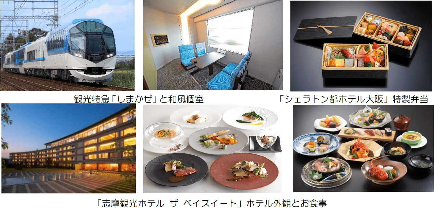 ホテルでのコース料理に加え、往路は「しまかぜ」の和風個室で「シェラトン都ホテル大阪」特製弁当を、復路は「しまかぜ」の洋風個室で、志摩出身のパティシエが作る「お菓子職人おとべ」のオリジナルスイーツセットをお楽しみいただきます。