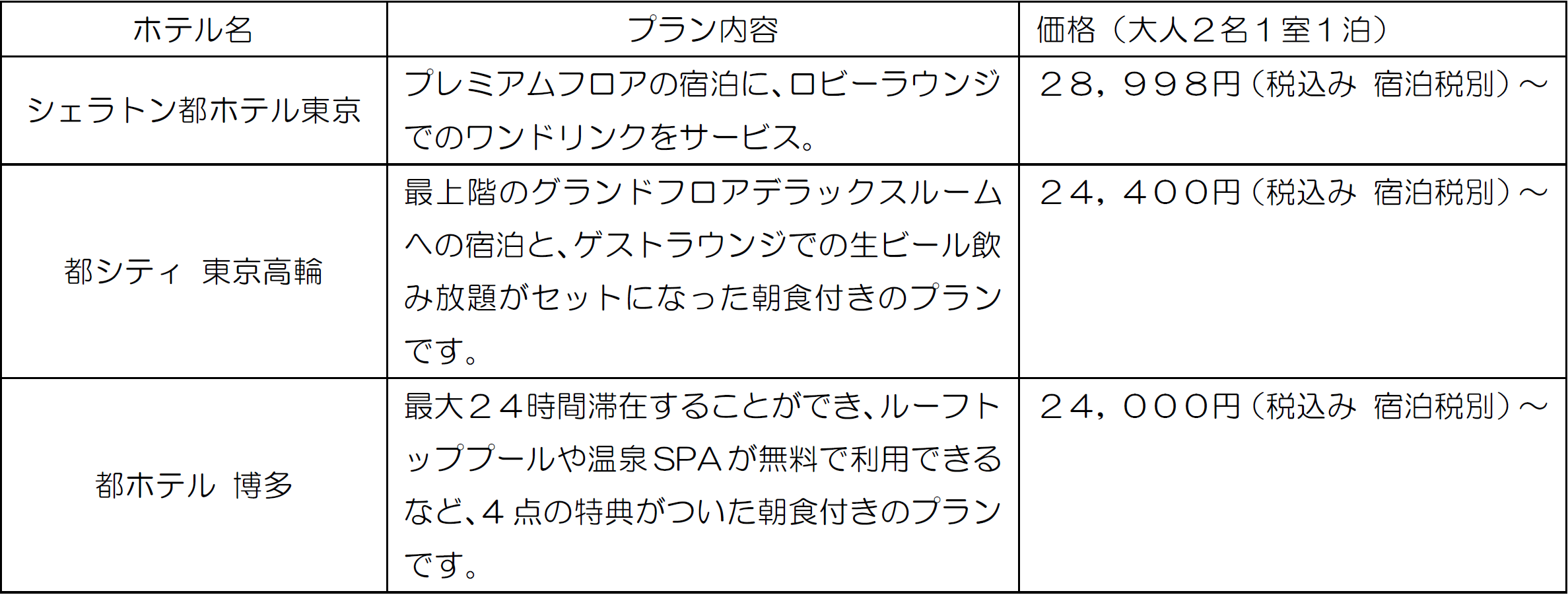 シェラトン都ホテル東京、都シティ 東京高輪、都ホテル 博多の3ホテルにて、本キャンペーン限定の宿泊プランをご提供します。