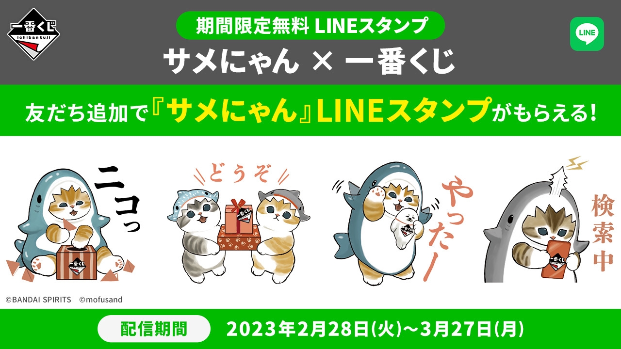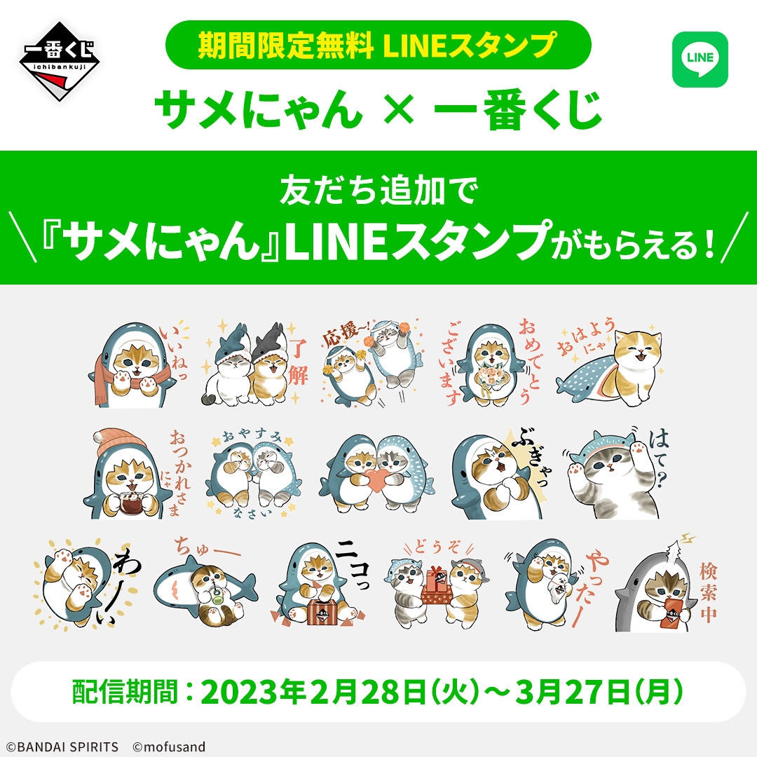 一番くじLINE公式アカウントを「友だち追加」すれば、2023年2月28日(火)~2023年3月27日(月)の期間限定で、『サメにゃん × 一番くじ』LINEスタンプを無料でダウンロードいただけます。
