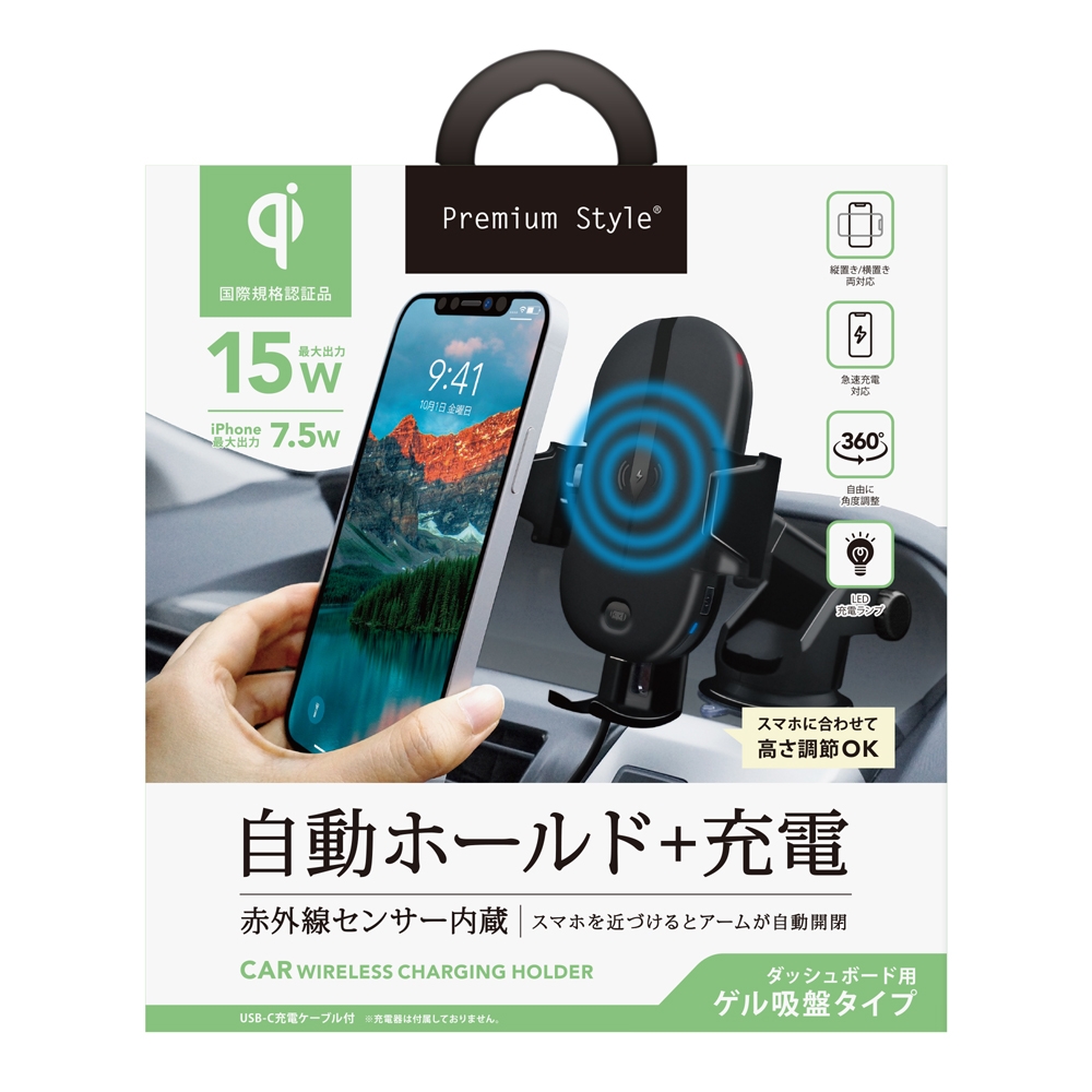 赤外線センサー内蔵でスマートフォンを近づけると自動ホールドする車載用ワイヤレス充電ホルダー(ダッシュボード用ゲル吸盤タイプ)です。国際標準規格「Qi(チー)」に準拠し、最大15W(iPhoneは最大7.5W)の急速充電に対応しています。