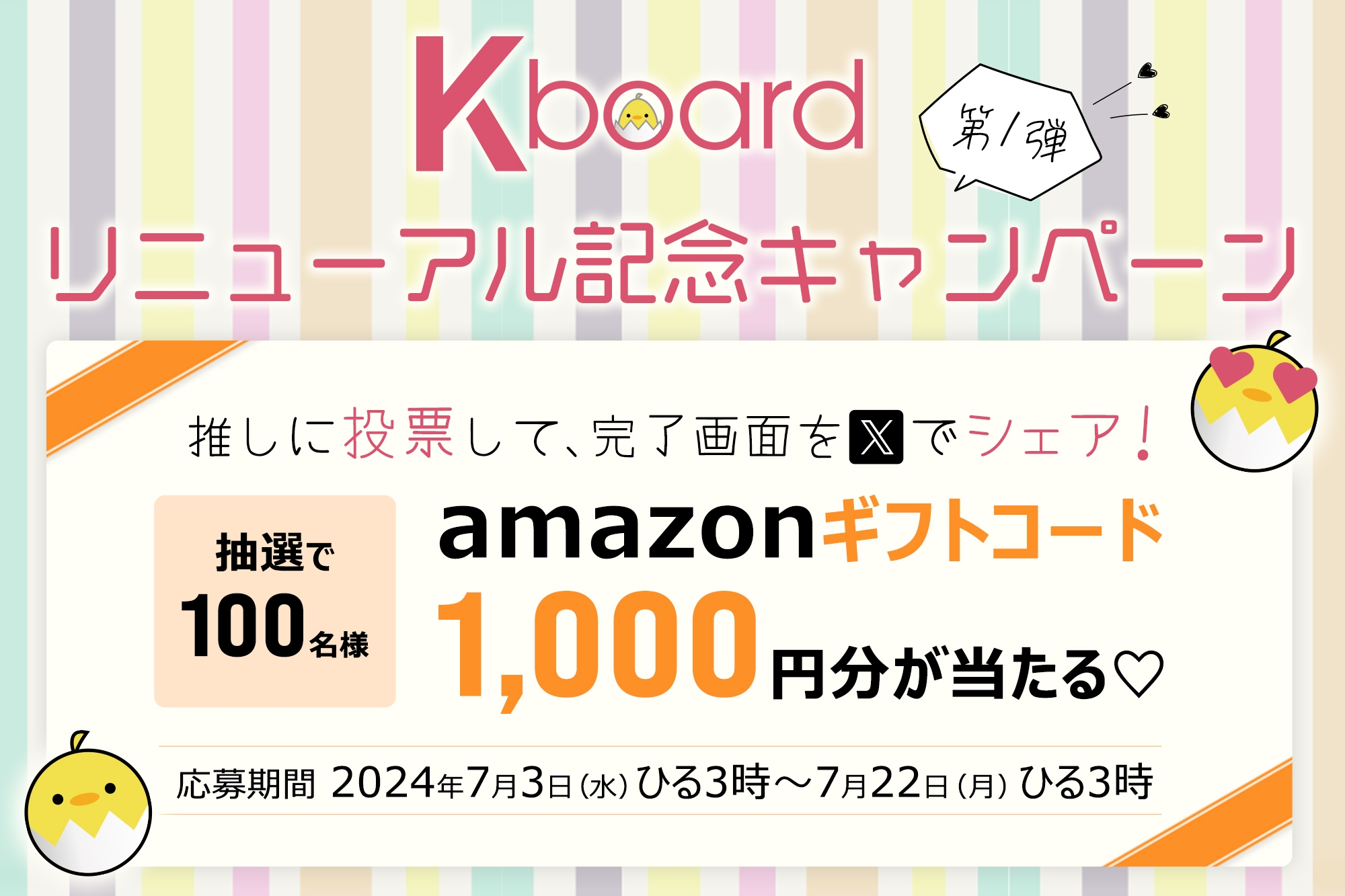 Kboardのリニューアルを記念して、プレゼントキャンペーンを実施いたします。Kboardで開催中のいずれかの投票企画で推しに投票し、投票完了画面からXへ投稿いただいた方の中から抽選で100名様にAmazonギフトコードをプレゼントいたします。
