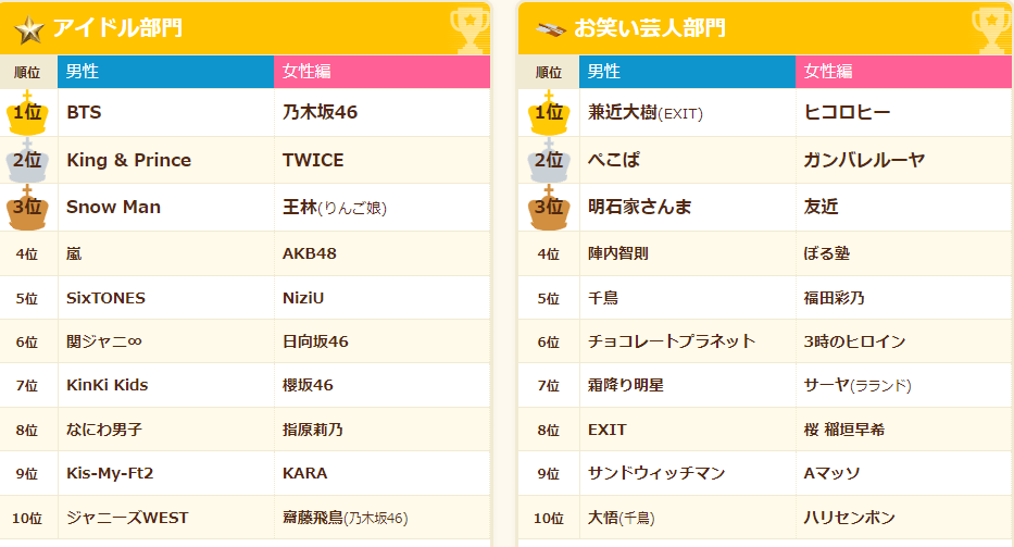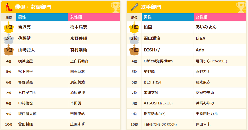 新たに登場したユーチューバー部門の1位はHIKAKINさんとピアニストのハラミちゃんです。ユーチューバー第一人者とも言えるHIKAKINさん、女性部門はYouTubeから人気に火がついたハラミちゃんが初代栄冠となったことは納得の結果です。女性部門第9位にはドラマ「silent」でも絶賛活躍中の川口春奈さんが女優にして唯一ランクインしました。