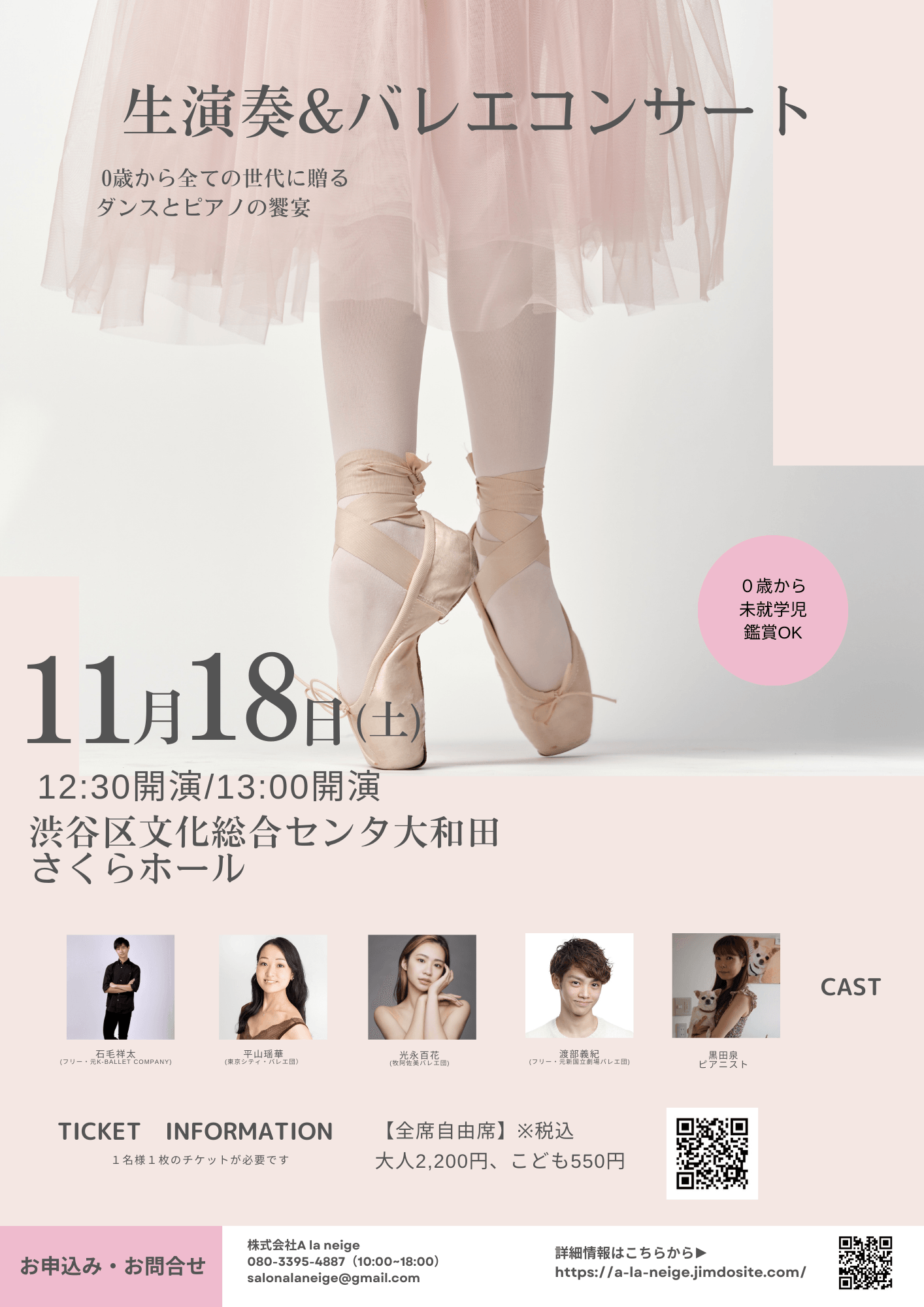 株式会社A la neige主催、『生演奏&バレエコンサート~ピアノとダンスの饗宴~』が2023年11月18日 (土)に渋谷区文化総合センター大和田4階さくらホール(東京都渋谷区桜丘町23-21)にて上演されます。