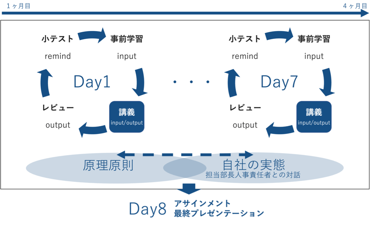 講義前の事前学習と事後のレビュー・小テストにより内容が定着すると共に、自社の人事責任者に自社の実態をヒアリングした上で改善策をアサインメントとして取りまとめることで、戦略人事としての実践的な力量を身につけていただく仕組みとなっています。