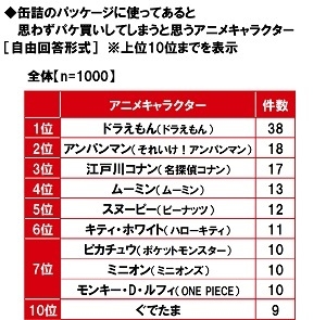 また、缶詰のパッケージに使ってあると思わずパケ買いしてしまうと思うアニメキャラクターを聞いたところ、1位「ドラえもん(ドラえもん)」(38件)、2位「アンパンマン(それいけ!アンパンマン)」(18件)、3位「江戸川コナン(名探偵コナン)」(17件)となりました。