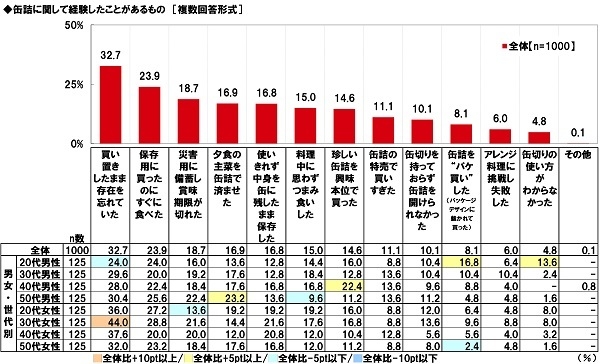 全回答者(1,000名)に、缶詰に関して経験したことがあるものを聞いたところ、「買い置きしたまま存在を忘れていた」(32.7%)が最も高く、次いで「保存用に買ったのにすぐに食べた」(23.9%)、「災害用に備蓄し賞味期限が切れた」(18.7%)となりました。長期保存ができるため、つい買ったことを忘れてしまったり、災害用の備蓄品としてストックしたまま賞味期限が切れてしまったりすることがあるようです。普段の食事で非常食を定期的に食べて、食べた分をまた買い足していく“ローリングストック法”という備蓄方法があります。こうした方法を取り入れることで、食べ忘れや賞味期限切れを防ぐことができるのではないでしょうか。