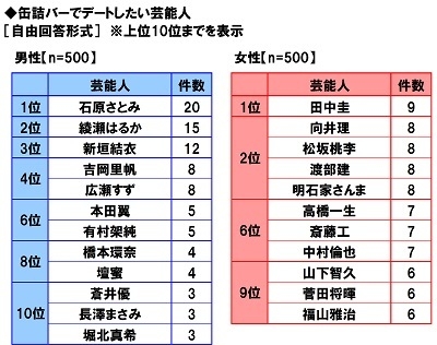 ◆缶詰バーでデートしたい芸能人 男性人気1位「石原さとみさん」、女性人気1位「田中圭さん」