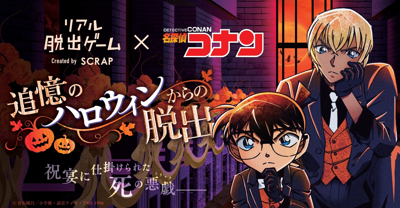 株式会社SCRAP(本社:東京都渋谷区 代表:加藤隆生)は、大人気テレビアニメ「名探偵コナン」とコラボレーションしたリアル脱出ゲーム『追憶のハロウィンからの脱出』の描き下ろし新ビジュアルならびにオリジナルグッズ情報、さらに開催都市の追加を発表いたします。