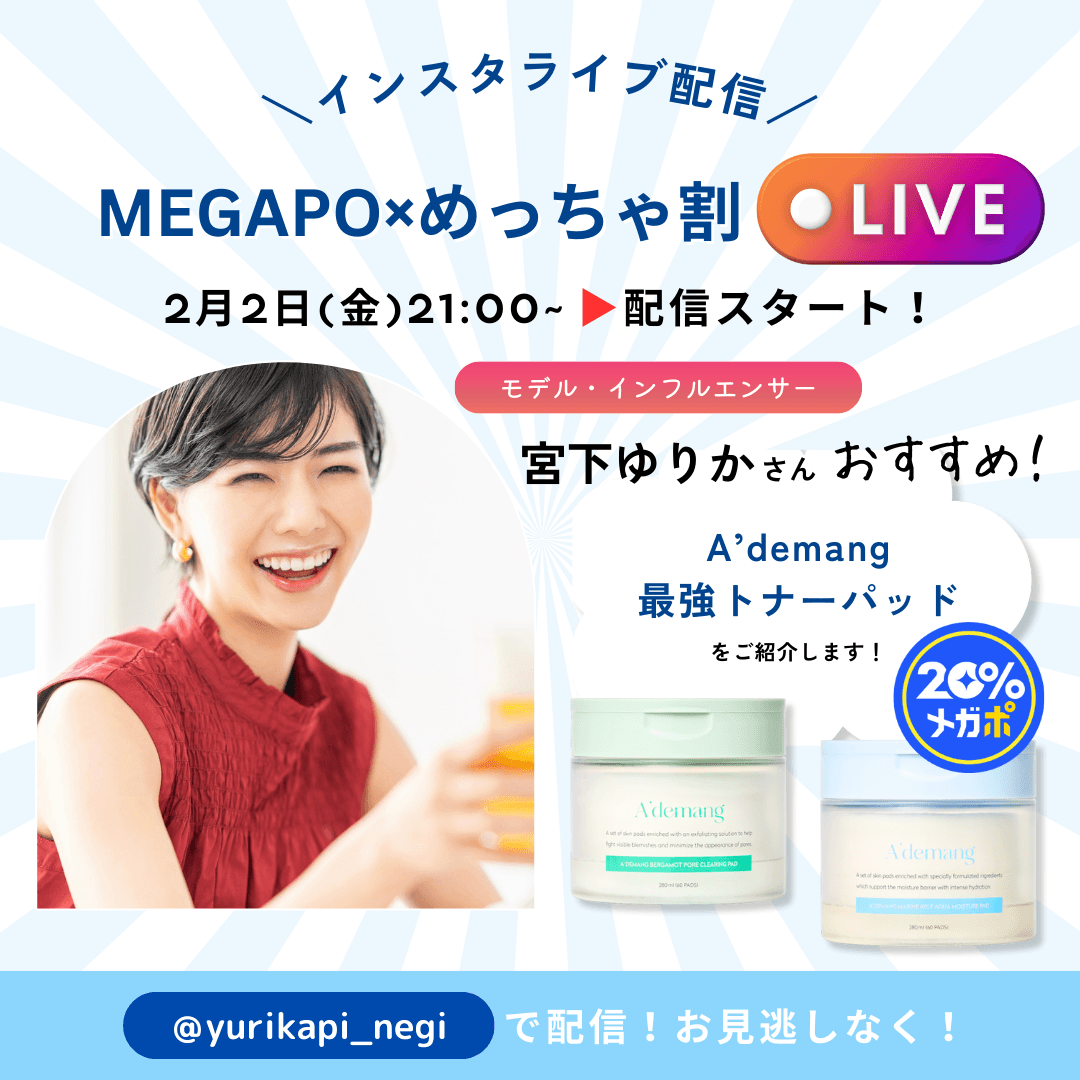 内容:『MEGAPO×めっちゃ割』やトナーパッド、ゆりかぴさんおすすめの使い方、韓国美容についてなど盛りだくさん!!