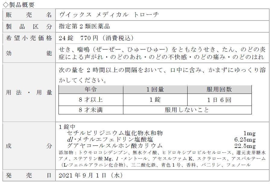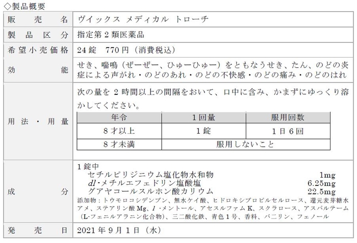 大正製薬株式会社[本社:東京都豊島区 社長:上原 茂](以下、当社)は、「ヴイックス」ブランドから、医薬品である、「ヴイックス メディカル トローチ」(指定第2類医薬品)を9月1日(水)より発売いたします。
