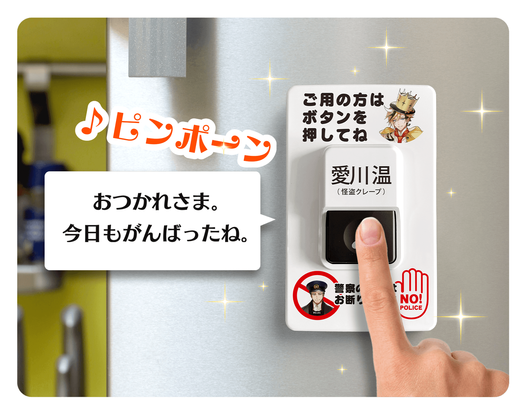 ゲームに参加し、エンディング結果をTwitterでシェアした方から抽選で10名様に、怪盗クレープの甘いボイスが聴ける「冷凍庫用マグネット式音声チャイム」をプレゼントします。10個すべて異なる音声となっており、どの音声が当たるかは届いてからのお楽しみです。