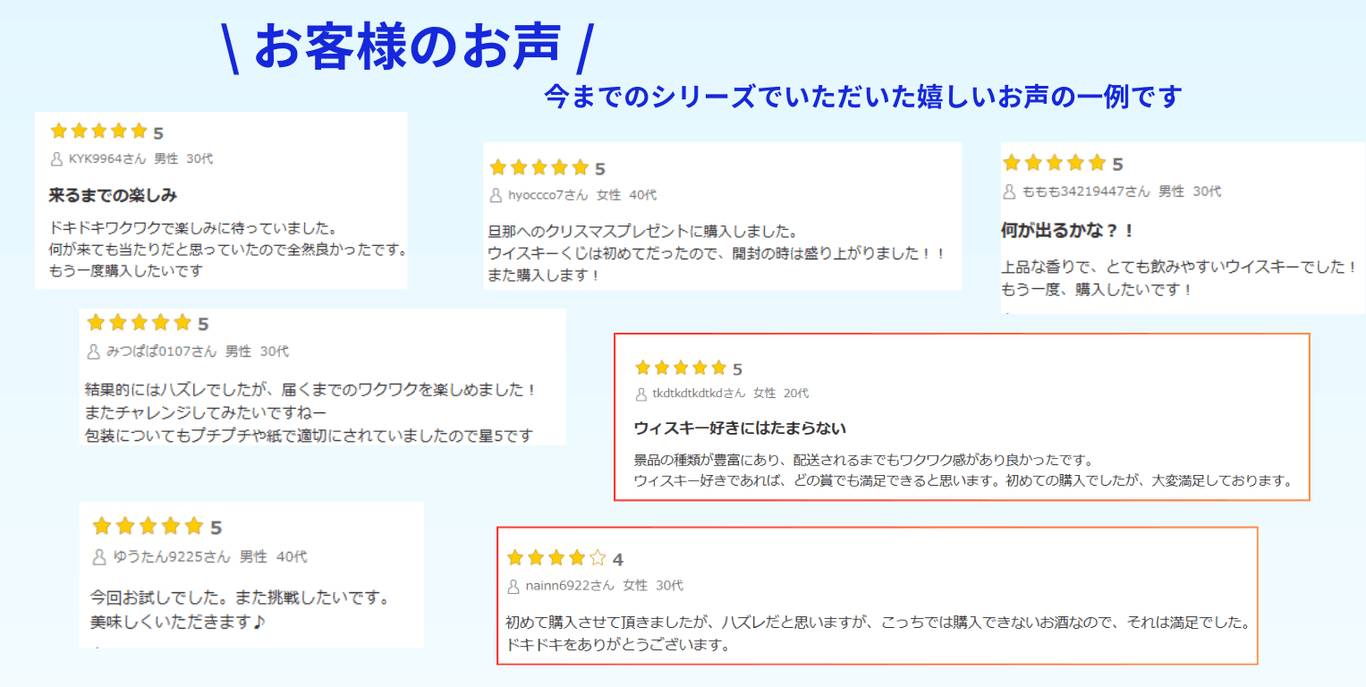 多くのお客様から、「上品な香りでとても飲みやすいウイスキーでした!」「開封した瞬間のワクワク感がたまりません。」といった嬉しいお声をいただいています。