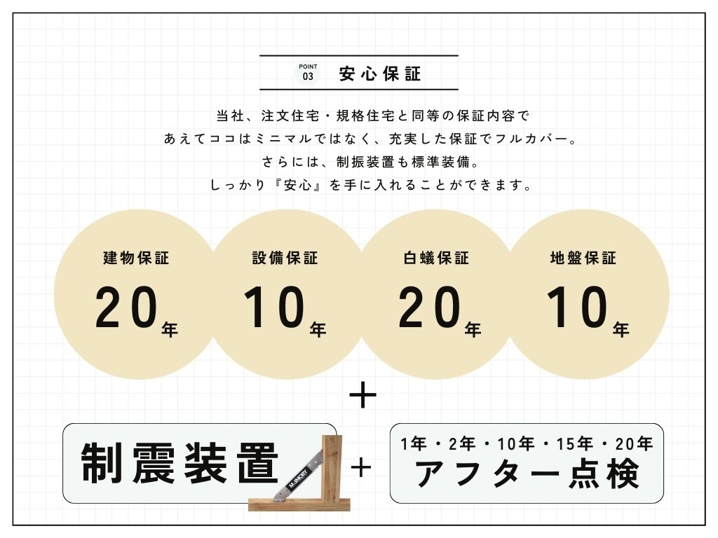 さらに、制振装置も標準装備し、定期的なアフター点検も実施するため、安心して長くお住まいいただけます。