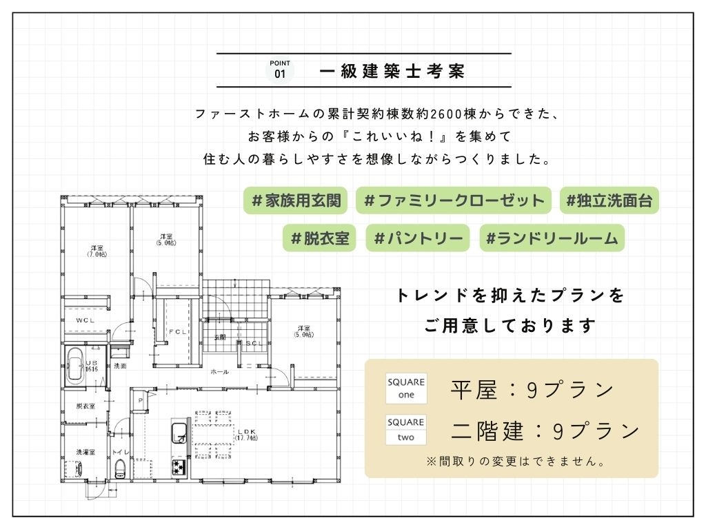 カーボンニュートラルに貢献する「ZEH」を標準仕様とし、ファーストホームの累計契約棟数約2,600棟の家づくりの中から、好評だったお客様の声を集めて住む人の暮らしやすさを第一に考え、一級建築士監修のもと開発しました。建築坪数に応じて「SQUARE one(平屋)」・「SQUARE two(二階建)」を各9プラン用意しています。