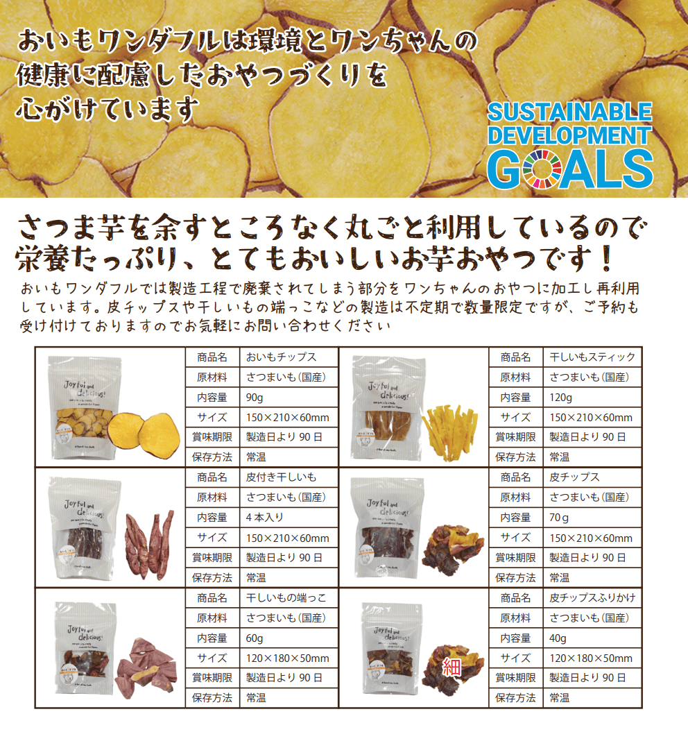 おいもワンダフルは、お芋スイーツ専門店の経験と技術を生かし、素材に拘り厳選したさつまいものほっこりとした甘さと風味を、飼い主様が安心してワンちゃんに味わって欲しいという思いで立ち上げたワンちゃん用のお芋のおやつ専門店です。無添加、手作りに拘り、国産素材のみ使用し、調味料、油を一切使わない、自然の美味しさを楽しんで頂けます。