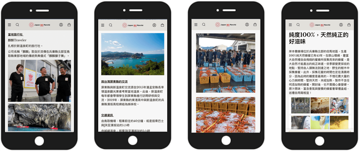 左から:パートナー麒麟トラベラーの紹介/産地を訪日旅行者の視点で紹介/漁解禁ニュース等発信/産品製造過程の紹介