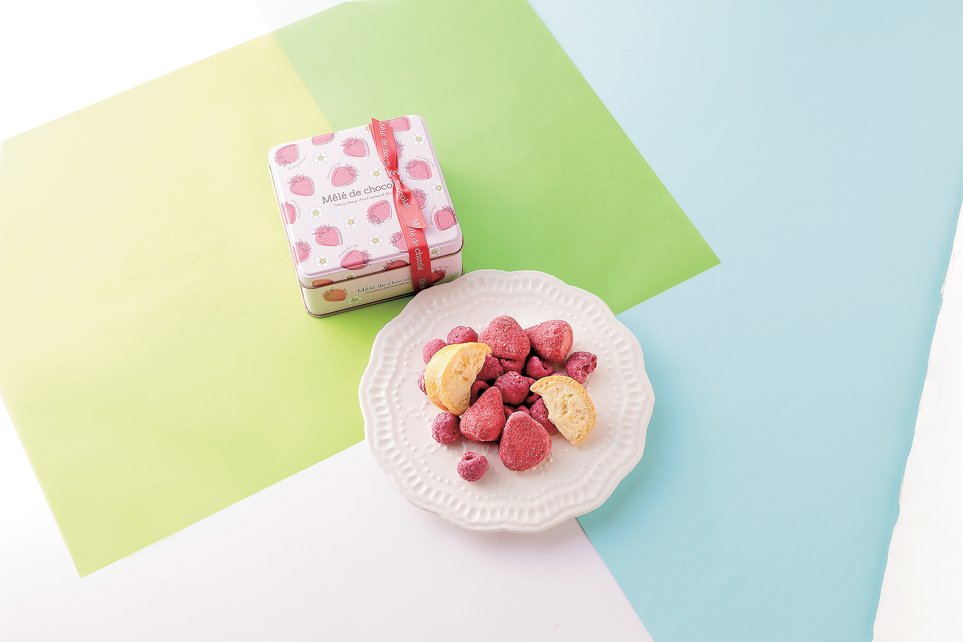 フリーズドライのフルーツにチョコを染み込ませた新食感ショコラ。ストロベリー、ラズベリー、青島みかんの3種をアソート。