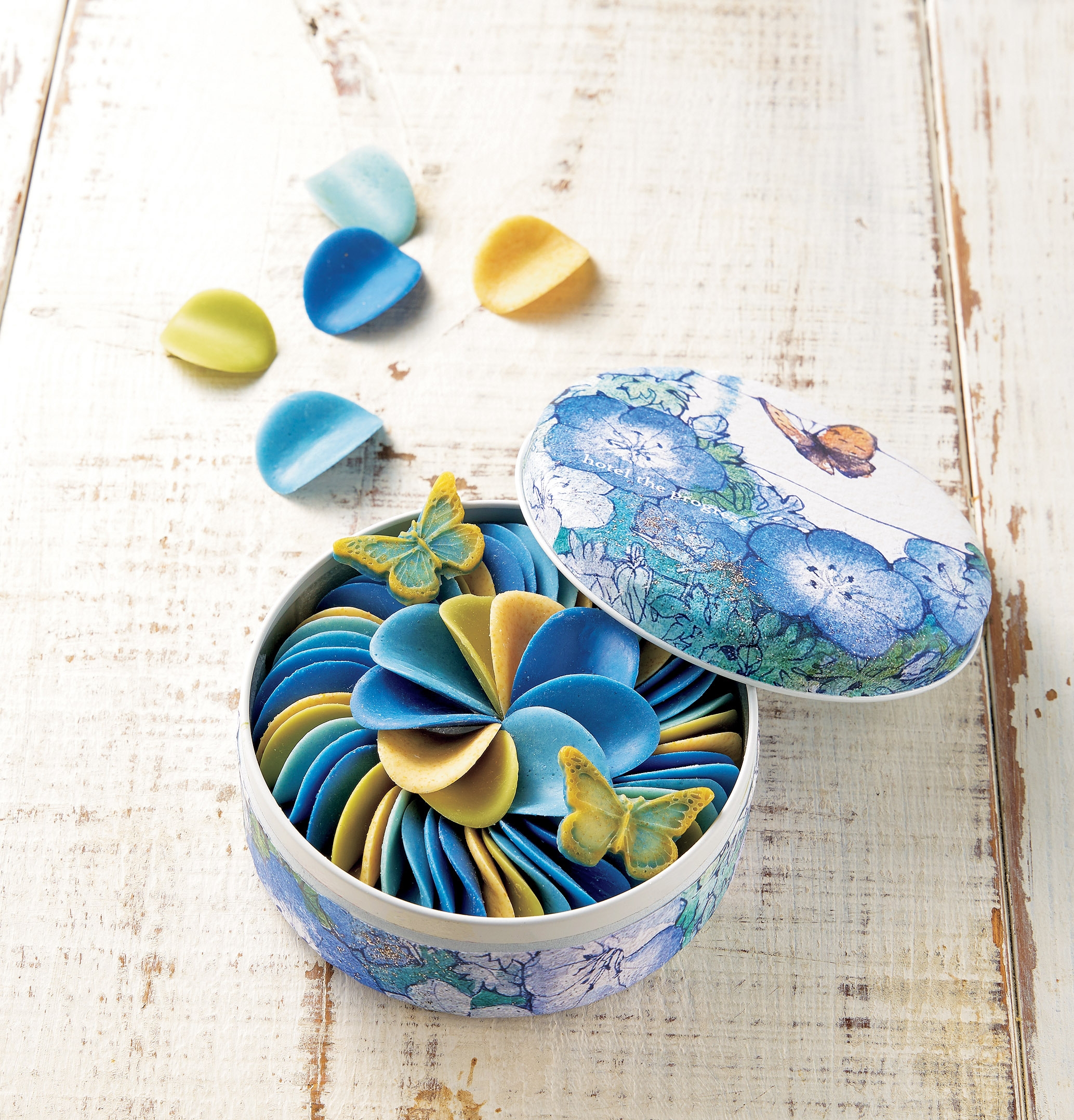 自然由来の素材にこだわるスイーツを展開。花びらのようなペタルチョコに、パピヨンをかたどったオーナメントチョコを添えて。