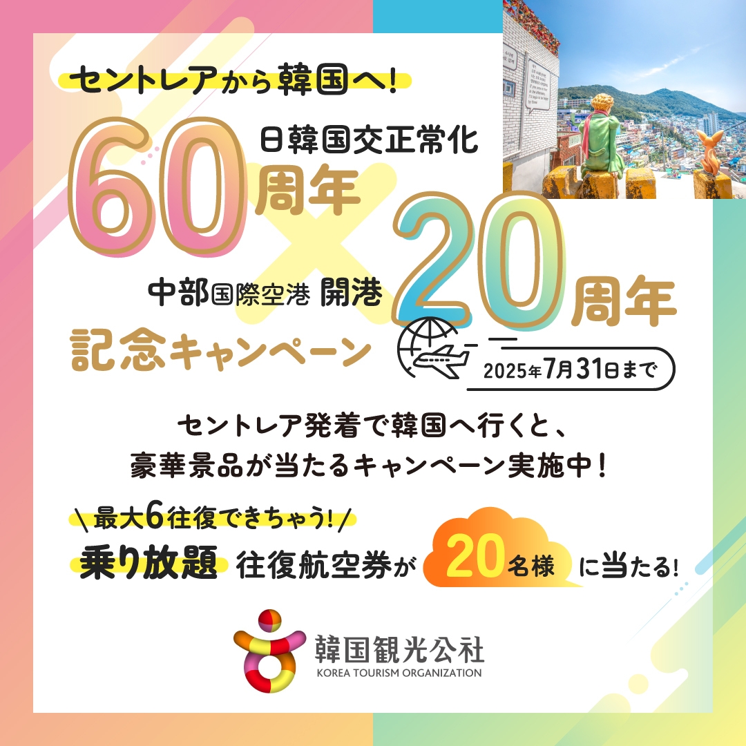 セントレアから韓国へ行こう! 日韓往復乗り放題航空券などが当たる! 「日韓国交正常化60周年×中部国際空港開港 20周年記念キャンペーン」実施