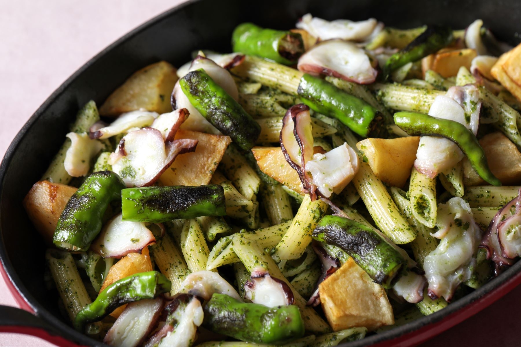 チャンジャとエリンギのペペロンチーノ(イタリア×韓国)/本日のパスタ(イタリア)/旬魚のロースト カポナータのピュレとタプナード(イタリア)/白身魚のフリット 青ネギと韮とヤンニョムソース(韓国)